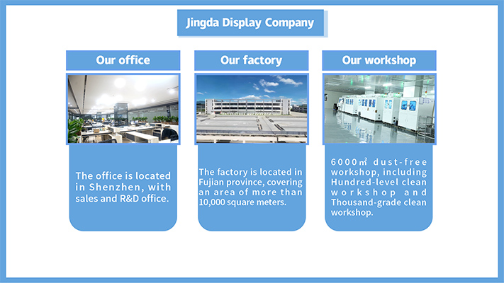 जिंगडा डिस्प्ले छोटे-मध्यम आकार के डिस्प्ले मॉड्यूल का निर्माण करता है, जिसमें मोनोक्रोम एलसीडी और एलसीएम, 0.96-25 इंच टीएफटी और ओएलईडी एलसीएम शामिल हैं।