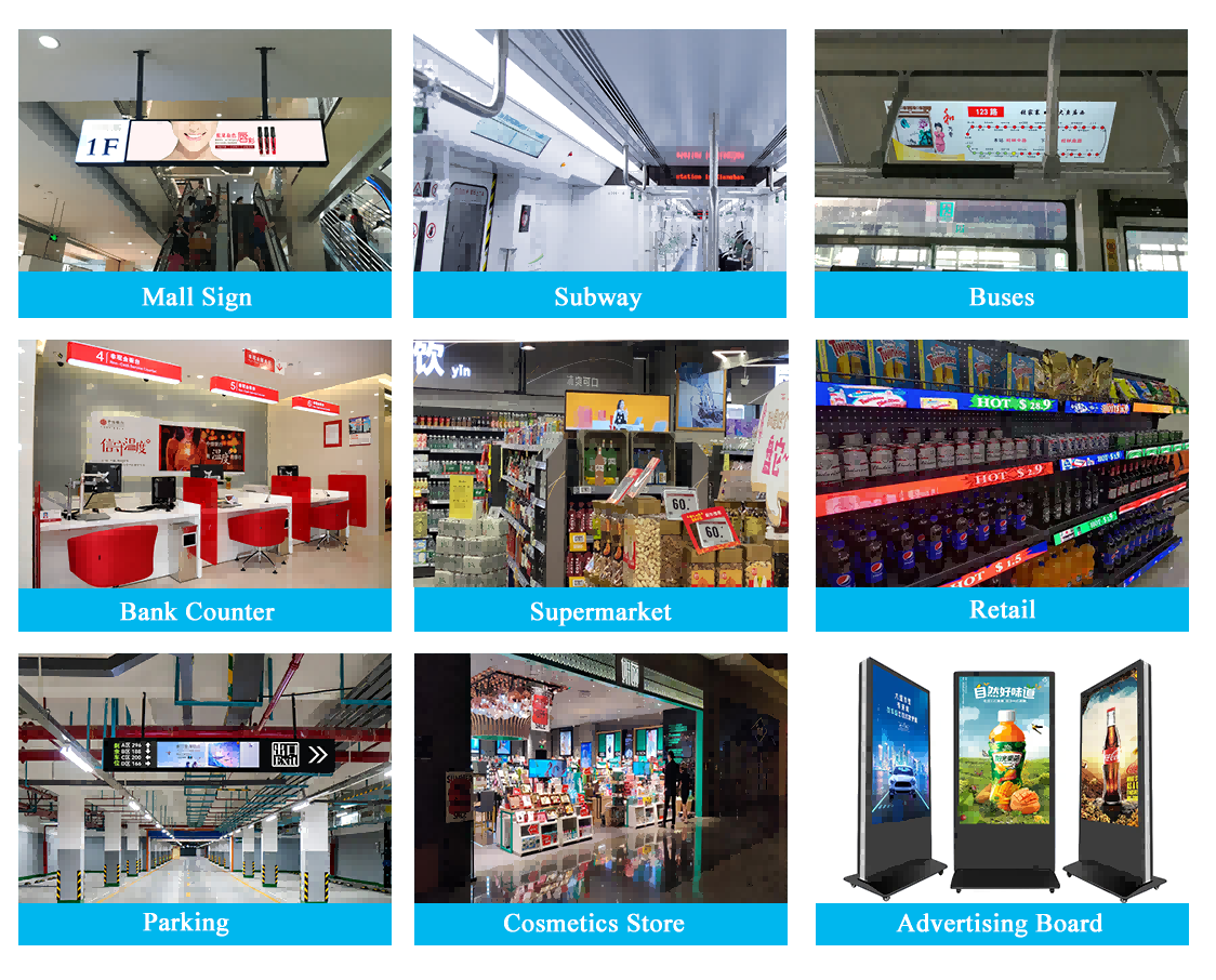 स्ट्रेचेड बार डिस्प्ले में एप्लिकेशन परिदृश्यों की एक विस्तृत श्रृंखला होती है, जिसका उपयोग मुख्य रूप से खुदरा, वाणिज्यिक विज्ञापन, सार्वजनिक परिवहन, सुपरमार्केट और बैंकों आदि में किया जाता है।